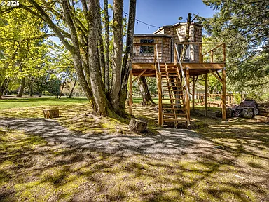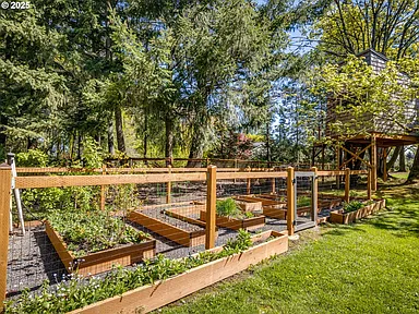 This isn't just another new build; it's got this cool, modern architectural style that feels really special and was built with so much care. Think about the light streaming in through all the windows, highlighting the vaulted ceilings and the beauty of your own private, treed oasis. You've got a huge yard to enjoy, complete with a fenced garden – imagine fresh veggies right outside your door! Plus, a charming chicken coop/shed and a treehouse that's just begging for adventures.